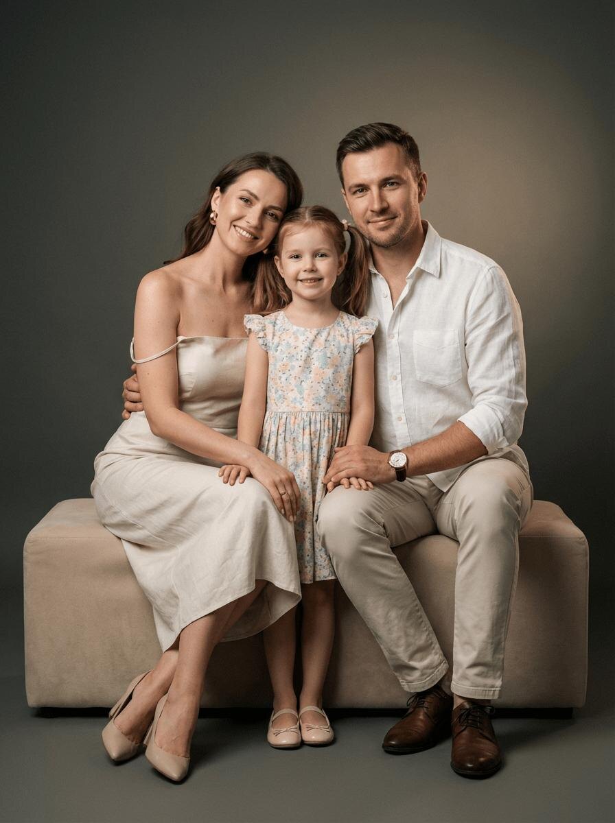 Сгенерировать фото⚡️ Перейти в бота 🤖 Используй лица мужчины, женщины и ребенка с загруженных фото. Гиперреалистичный кинематографичный студийный портрет молодой красивой семьи из трёх человек: мама, папа и дочь. Вертикальный формат, средний план, ракурс на уровне глаз. Высочайшая детализация, разрешение 8K, натуральные текстуры кожи с видимыми порами, реалистичные волосы, фактура одежды. Композиция: родители сидят на мягком бежевом студийном пуфе или скамье, папа слегка обнимает маму за талию. Дочь стоит между ними, чуть впереди, опираясь маленькими ручками на колени родителей. Все трое смотрят в камеру с лёгкими, искренними улыбками. Взгляды тёплые, живые, естественные. Мама чуть склоняет голову к дочери, папа смотрит уверенно и нежно. Мама: с естественным макияжем, подчёркивающим красоту, волосы мягкими волнами спадают на плечи. На ней светлое струящееся платье из натурального шёлка или льна, открытые плечи, лёгкие золотые серьги. Папа: ухоженный, в белой льняной рубашке с закатан