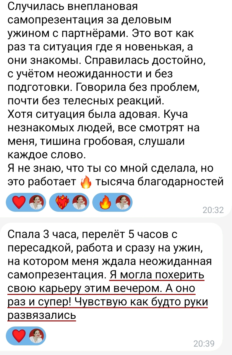 Если ты узнал(а) себя в Юлии, то я даю тебе гарантию, что ты спокойно сможешь избавиться от страха публичных выступлений за 5 сессий в работе со мной. Для этого тебе нужно сделать самый первый шаг — записаться ко мне на разбор.
