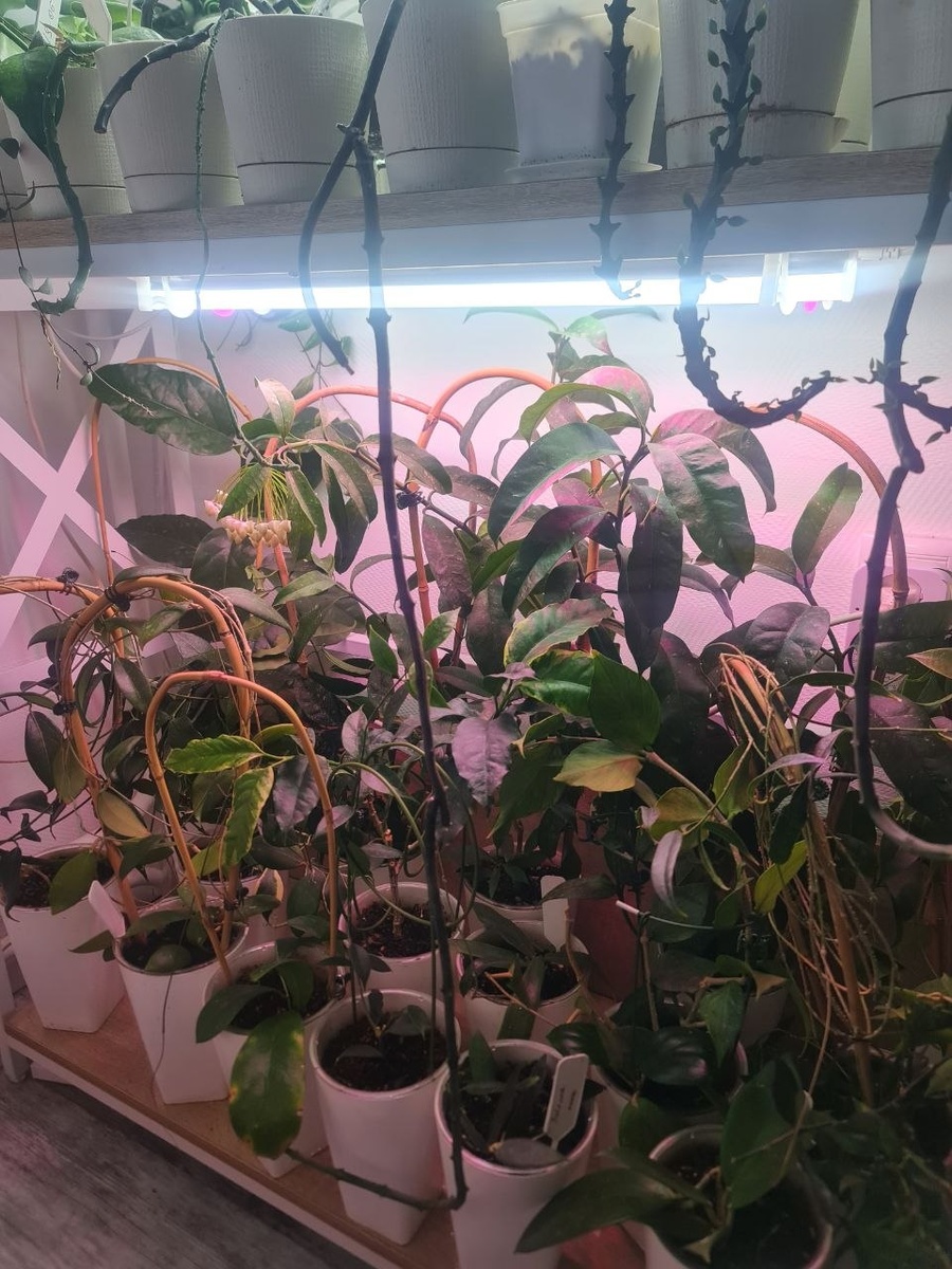 Кстати, насчитала у себя 780 экземпляров и это без дублей. От дублей здорово избавилась при переезде, но все же немного есть. Так вот, живут растения у меня в разных местах: 1. В старой квартире на лоджии, там в основном хойи и адешки. Освещение естественное. За ними ухаживает моя мама. 2. На даче. Там ахименесы, ластовневые (кроме хой), эпифиллумы, шлюмбергеры и рипсалидопсисы. Туда езжу каждые выходные. Почти все живут на фитиле. Но там прохладно, поэтому этой зимой им пришлось не просто. Напишу об этом отдельный пост. 3. В квартире где живу: лоджия - специально оборудовала ее, на окошках и вот на таком стеллажике. 4. Летом адешки переезжают в теплицу. Ну и еще есть "круговорот растений". Честно, я не люблю стелажи в квартире. Но при переезде, все у меня не влезли на лоджию. И еще выяснилось, что квартира, где мы сейчас живем очень, ну очень жаркая. Окна открыты круглый год, иначе +29 градусов. Поэтому стеллаж - вынужденная мера.