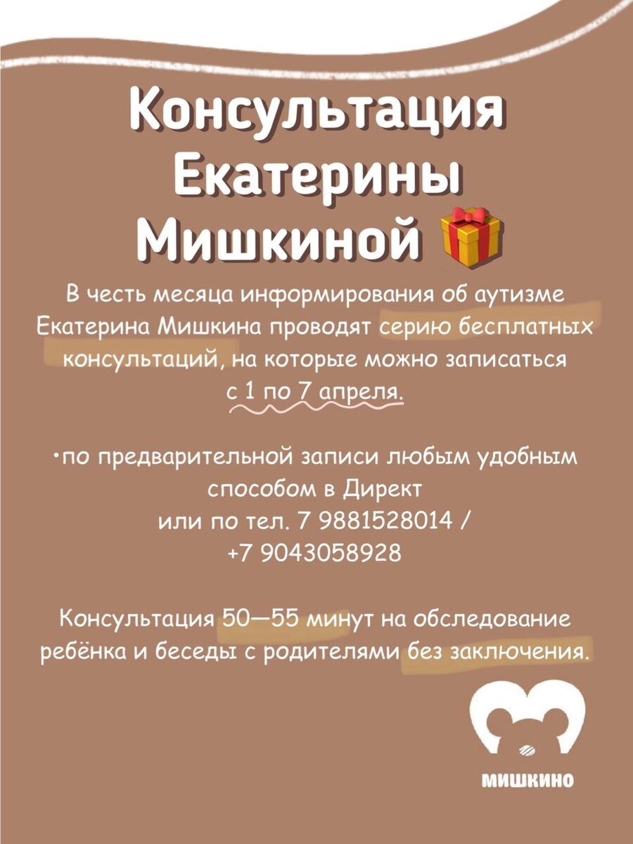 Екатерина Мишкина проводят серию бесплатных консультаций, на которые можно записаться с 1 по 7 апреля. •по предварительной записи любым удобным способом в лс @EkaterinaMishkina или по тел. 7 9881528014 / +7 9043058928 Консультация 50—55 минут на обследование ребёнка и беседы с родителями без заключения.