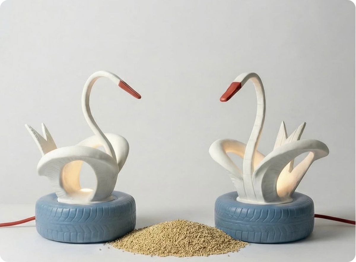 Скульптура-ночник бережно хранит узнаваемый образ из коллективной памяти и становится частью культурного кода. Их вырезали из старых автомобильных покрышек, красили белой краской и ставили у подъездов и детских садов. В наши дни лебеди из шин постепенно исчезают из дворов. Придомовые территории активно благоустраивают, а вместе с этим тихо и незаметно уходит целая визуальная эпоха. Исцеляющий дизайнер (по словам автора) в марте 2026 года презентовал своё новое творение, вдохновлённое уличным декором из покрышек. За десятилетия этот образ стал почти универсальным дворовым символом – знаком того самого «народного благоустройства», когда красоту создают своими руками. Немного иронии, немного ностальгии и один очень узнаваемый силуэт.