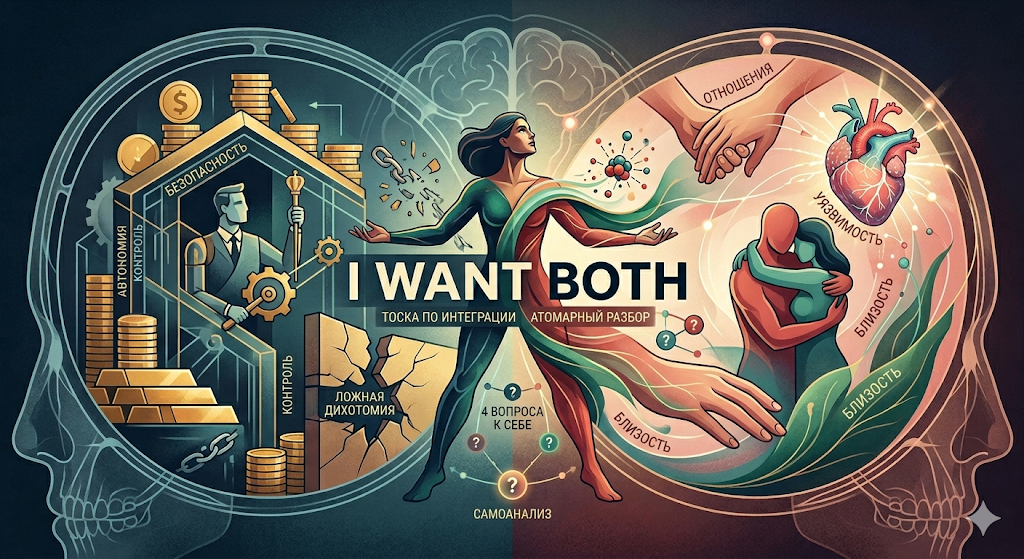 Почему «I want both» — это не жадность, а самое здоровое состояние психики? (Разбор на атомы) Раз уж мы только что объявили конец эры дуализма, давайте переложим это на то, что всем вам знакомо. Возьмем для разбора поп-культуру и трек Both (feat. 21 Savage & BIA) от Tiësto. На первый взгляд, это обычный клубный трек о роскоши, в котором мы слышим банальное «хочу и любви, и денег». Но если мы снимем этот поверхностный слой и пропустим текст через наш Рентген Архитектора, то увидим мощный, глубокий внутренний конфликт. Фраза «I want both» — это вовсе не история о жадности или материализме. Это крик психики, уставшей от внутреннего разрыва. Давайте разложим это терапевтически на элементы: Песня обнажает классический конфликт между двумя нашими частями: Поэтому психика так часто подсовывает нам ложный выбор: либо одно, либо другое. Она боится, что не сможет удержать оба эти состояния одновременно. В результате в голове рождается иллюзия. Мы начинаем верить, что: Это классическая когнитивна