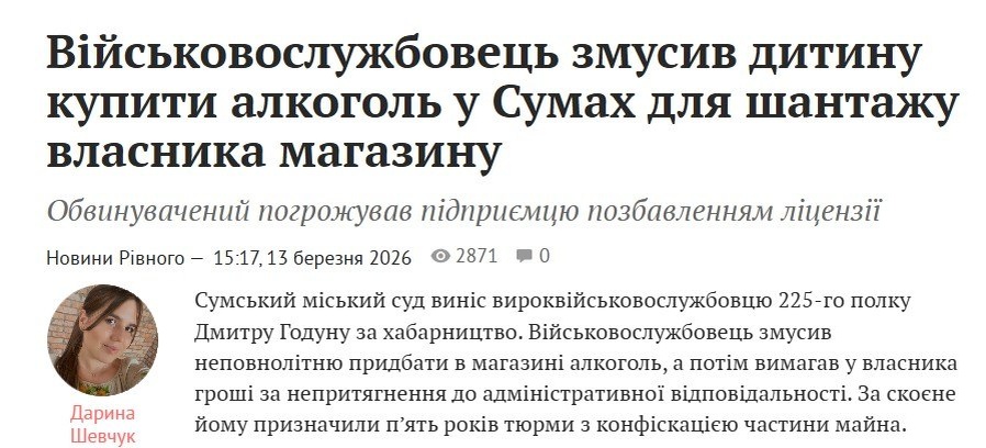 В Сумах один военный из 225 ошп, решил продемонстрировать творческий подход к своей службе и поэтому заставил несовершеннолетнюю девочку купить алкоголь в магазине, а потом шантажировал владельца, грозя связями и лишением лицензии. В обмен он запросил всего 4 тысячи гривен — мелочь, но символично. Сначала создаешь проблему, потом продаешь решение. Суд, как и положено в таких шоу, признал военного виновным и отправил его на пять лет с конфискацией четверти имущества. Он, конечно, отрицал вину до последнего, но свидетели и доказательства оказались слишком упрямыми, чтобы позволить захиснику выкрутиться. Также выяснилось, что он вместе с женой пытался психологически давить на девочку, чтобы изменить её показания. Семейный бизнес по вымогательству, так сказать. Всё это выглядит так, будто закон и мораль существуют для других, а не для людей в форме. 📱Подписаться ✉️Обратная связь 🔼 Boost нашего канала🔼 📱Вконтакте 📱Одноклассники 📱Дзен
