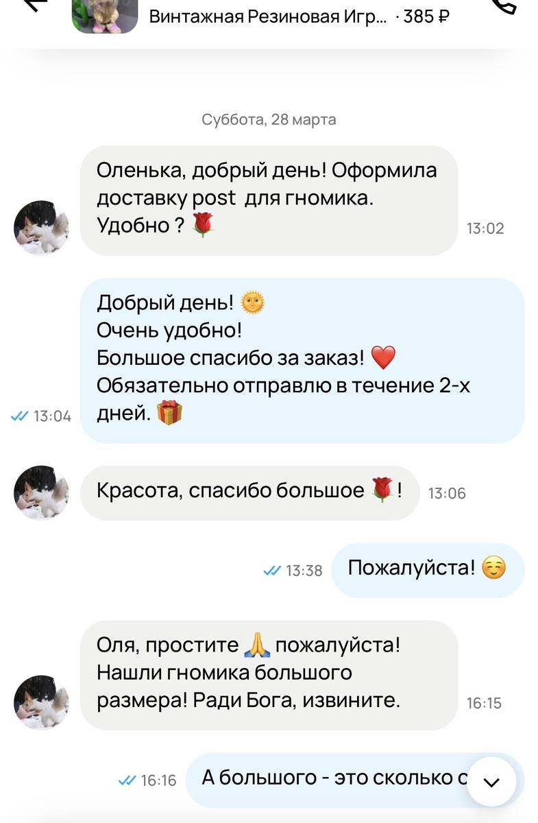 Первый раз за последнее время мне не хотелось оставлять отзыв на покупателя, обычно я пишу, не задумываясь. А здесь у меня какие-то двоякие чувства были. Возможно, я утрирую и со стороны это не так выглядит, но я это восприняла, как выпрашивание «Не мытьем, так катаньем»!