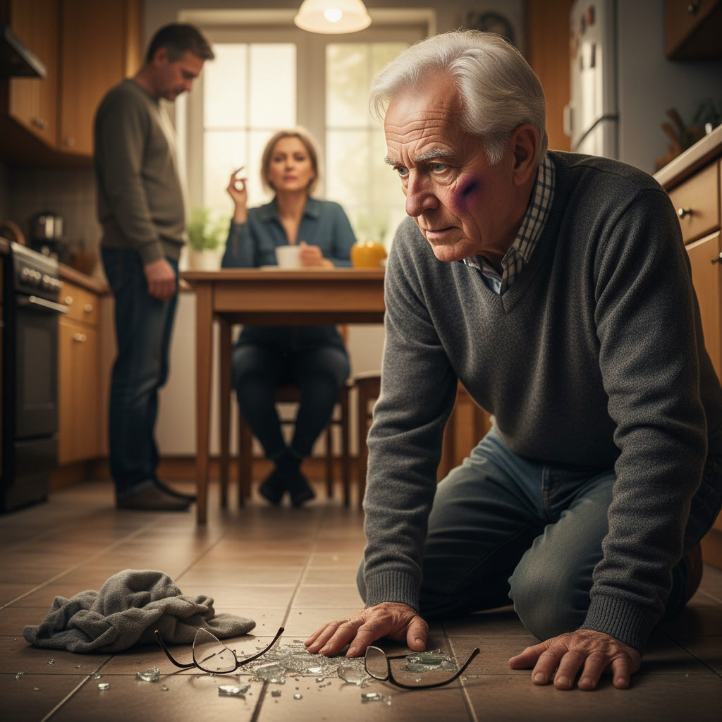 Виктор Петрович медленно, опираясь дрожащими руками о стул, поднялся на ноги. Колени тряслись, перед глазами всё плыло без очков, но он пересилил себя и начал собирать осколки. Пальцы плохо слушались, острые края стекла резали кожу, но он не чувствовал боли.