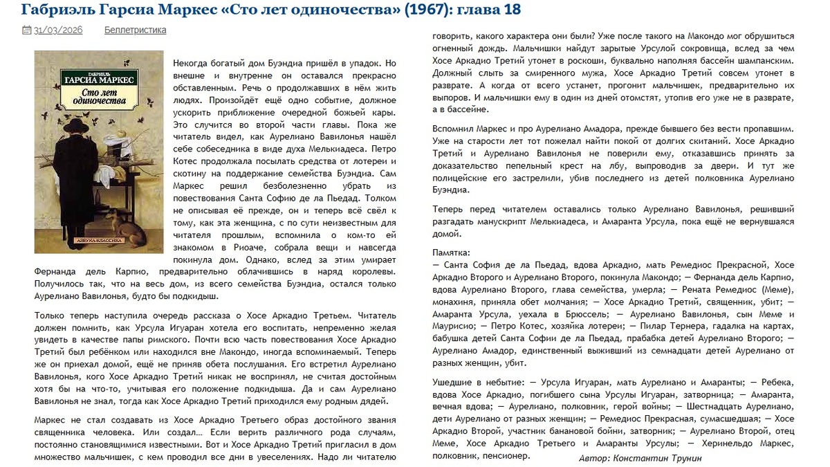 Габриэль Гарсиа Маркес «Сто лет одиночества» (1967): глава 18 | Критика