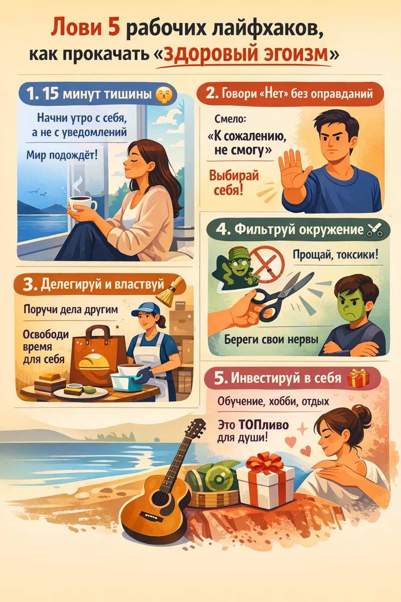 😈 Здоровый эгоизм: лайфхаки для себя. Давайте поговорим о теме, которую часто путают с токсичностью, хотя на самом деле это база твоего ментального здоровья. Разбираемся, что такое здоровый эгоизм и как внедрить его в жизнь без чувства вины. 👇 🚀 Здоровый эгоизм — это не про «мне плевать на всех», а про «я у себя на первом месте» Многие из нас выросли с установкой, что думать о себе стыдно. Но правда в том, что ты не можешь напоить другого из пустого кувшина. Если твой ресурс на нуле, ты не помощник, а комок нервов. Лови 5 рабочих лайфхаков, как прокачать этот навык: 1️⃣ Правило «15 минут тишины» 🤫 Начинай утро не с проверки уведомлений, а с себя. Кофе в тишине, растяжка или просто взгляд в окно. Это время неприкосновенно. Мир не рухнет, если ты ответишь в чате на 15 минут позже. 2️⃣ Учись говорить «Нет» без оправданий 🙅♂️ Когда ты говоришь «да» другим, убедись, что не говоришь «нет» себе. Если коллега просит доделать его отчет, а у тебя свидание или просто желание полежать