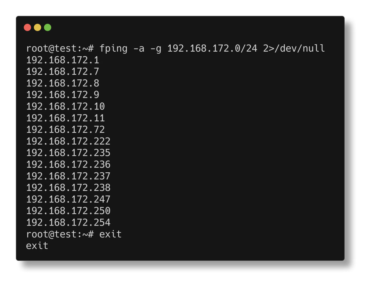 Такая задача встречается довольно часто, когда вам нужно получить список «живых» узлов подсети, неважно с какими целями и сделать это нужно быстро и просто. Вам поможет утилита fping, для ее установки воспользуйтесь командой: apt install fping Затем запустите ее с ключами: fping -a -g 192.168.172.0/24 2>/dev/null Разберем части команды подробнее: ▫️Ключ -a – предписывает вывести узлы, которые отвечают на ping ▫️Ключ -g – генерировать узлы назначения из указанного диапазона, можно указать начальный и конечный адреса через пробел или CIDR, как в нашем случае ▫️ 2>/dev/null – подавляет вывод потока ошибок, чтобы не выводить сообщения о недоступных узлах Как видим, поставленная нами задача решена просто и быстро. Но это еще не все, рекомендуем ознакомиться со всеми возможностями fping выполнив: fping -h Кстати, советуем регулярно обращаться к справке даже тех утилит, которые вы знаете, это поможет узнать что-то новое (новые ключи) или вспомнить некоторые забытые возможности.