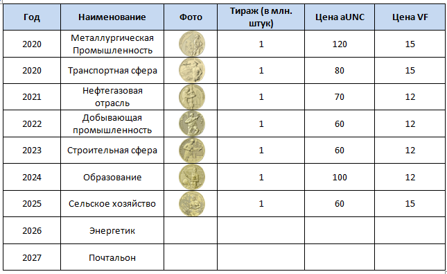 Для тех, кто собирает российские юбилейные монеты, я приготовил вот такую табличку, куда внес средние цены на монеты из серии "Человек труда". Эти монеты начали выпускать с 2020 года: Тираж у всех монет на данный момент - 1 миллион штук. Как видно, цены на них не очень высокие. Обратите внимание, эти цены я взял как средние на ресурсах для коллекционеров, где торгуют "частные лица". К этой цене еще нужно добавлять стоимость пересылки - 100-150 рублей. Понятно, что покупать монеты по одной штуке в этом случае нет никакого смысла. Тогда уж проще заглянуть в любой маркетплейс, где можно купить монету хоть и дороже указанных здесь цен, но при этом не нужно отдельно оплачивать доставку. Да и будет экономия времени, которую обычно тратят на переписку с продавцами. Короче, уже так получается, что покупку единичных монет можно делать и на маркетплейсах. А вот если покупать кучкой - то там возможны варианты. Если внимательно посмотреть на цены, то можно увидеть, что в среднем все монеты ст