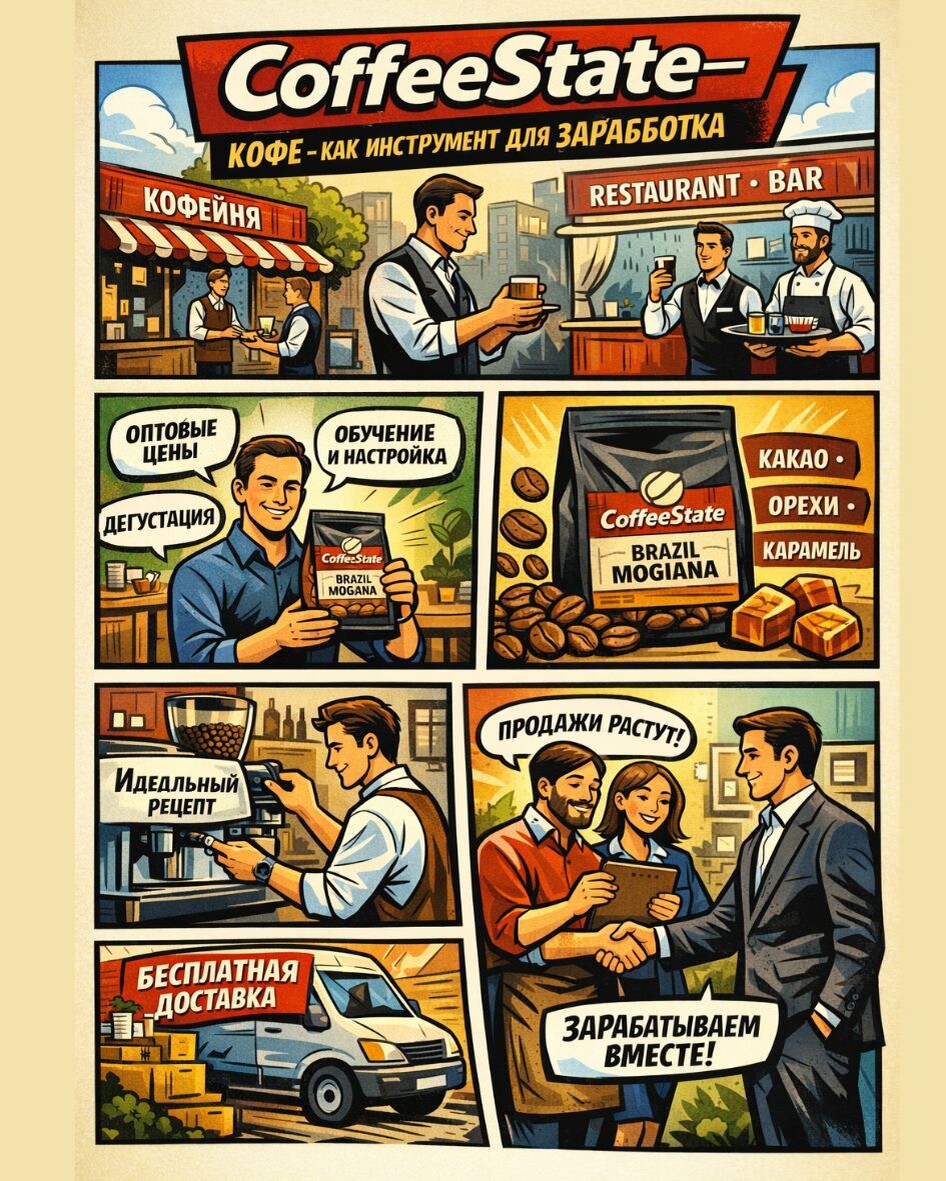 Бренд CoffeeState — это не просто кофе. Это подход, при котором кофе становится не расходником, а инструментом, который напрямую влияет на выручку, стабильность и развитие заведения. «Территория Кофе» — это не только специализированный магазин, мы кофейная компания. Мы работаем не только с розничными покупателями, но и с профессиональными участниками рынка: — кофейнями — кофебарами — ресторанами — барами Везде, где кофе — это часть бизнеса и источник дохода. Собственная торговая марка кофе CoffeeState Более двух лет назад мы развиваем собственную торговую марку — CoffeeState Это линейка кофе, созданная под реальные задачи HoReCa: — стабильный вкусовой профиль — понятный вкус для гостя — удобство настройки — предсказуемый результат в потоке — экономика, которая работает Это не “кофе ради кофе”. Это кофе, который помогает зарабатывать. Сегодня расскажем про базу нашей линейки — кофе Brazil Mogiana Ключевой продукт в линейке — Brazil Mogiana (Бразилия Можиана) Классический профи