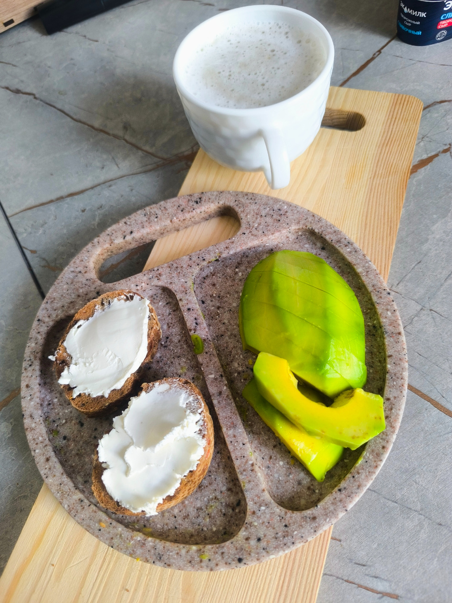 Кофе молотый с молоком. Хлеб фитнес с творожным сыром. Авокадо .