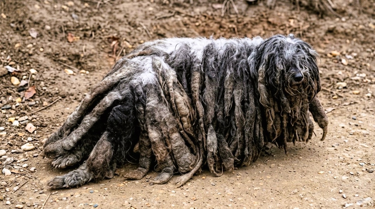Тогда-то они и заметили странное животное, бредущее вдоль дороги. Это была не просто неопрятная собака. Пёс выглядел как сплошной колтун.