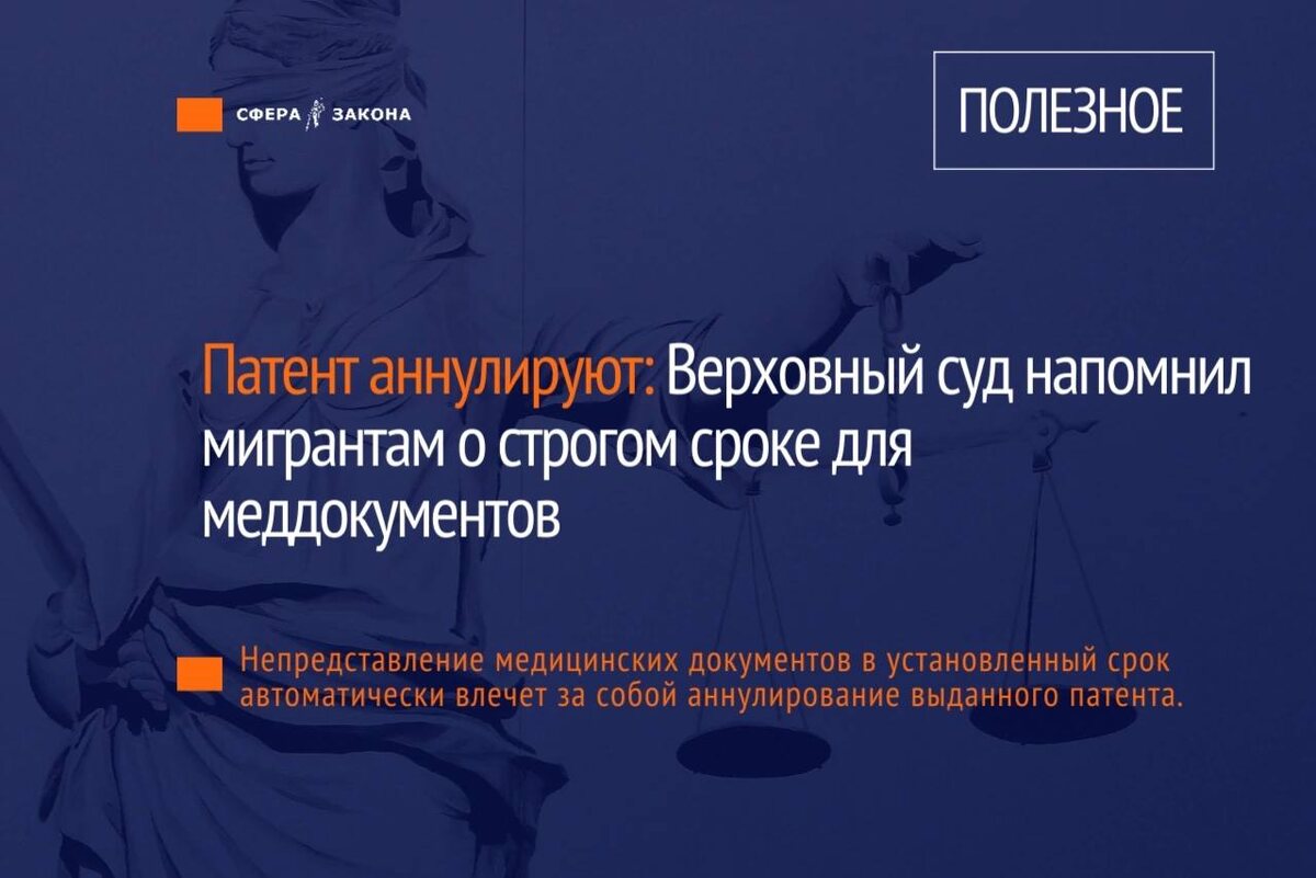 📑 Верховный суд РФ в очередной раз подтвердил жесткое правило: отсутствие актуальных медицинских документов стало безусловным основанием для аннулирования патента на работу. Разъяснение было опубликовано в квартальном обзоре судебной практики на конкретном примере. В центре спора оказался гражданин Узбекистана, чей патент в Челябинской области был аннулирован полицией. Иностранец попытался оспорить это решение: местный суд встал на сторону ведомства, но апелляционная и кассационная инстанции неожиданно поддержали мигранта. Однако Верховный суд отменил их решения и оставил в силе первоначальный отказ. ❗️Высшая инстанция детально разъяснила механизм, действующий для всех иностранных граждан. По закону, приезжие обязаны пройти медосвидетельствование и сдать документы (подтверждающие отсутствие наркотической зависимости, опасных инфекций и ВИЧ) в течение 30 дней с момента въезда в страну. Но ключевым нюансом является обязанность проходить эту процедуру ежегодно: спустя год после предыд