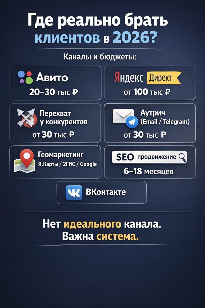 Где реально брать клиентов в 2026 (разложил по каналам и бюджету