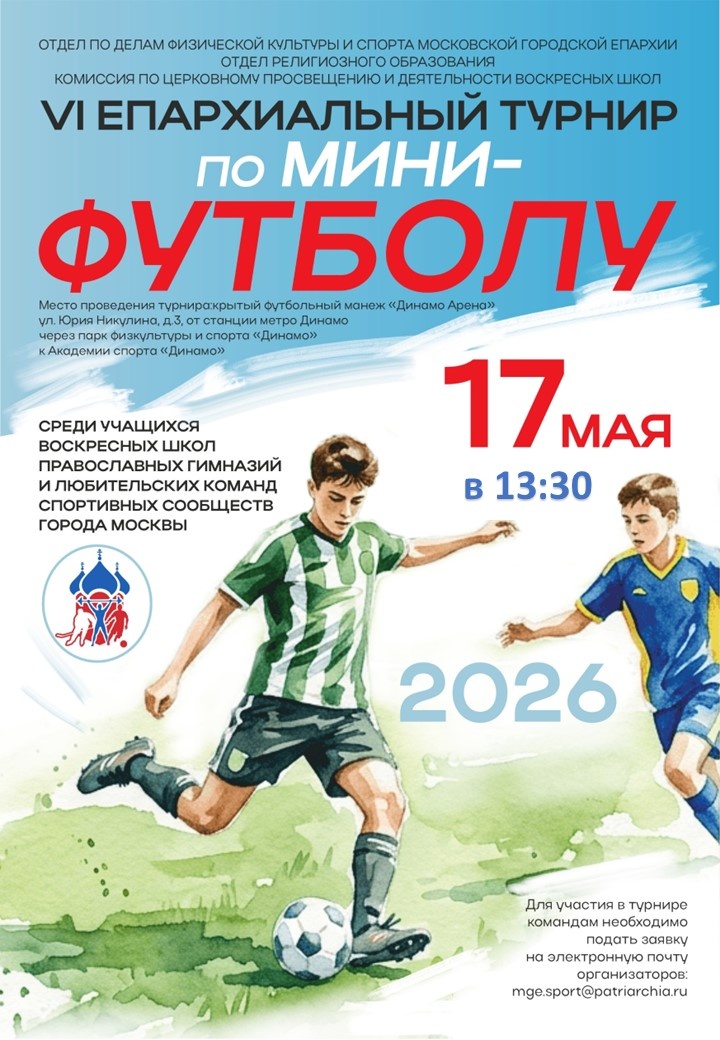 17 мая 2026 года в крытом футбольном манеже «Динамо Арена» состоится VI Епархиальный турнир по мини-футболу среди учащихся воскресных школ, православных гимназий и любительских команд спортивных сообществ города Москвы. Начало соревнований в 13:30. Организаторами соревнований выступают Отдел по делам физической культуры и спорта Московской (городской) епархии при поддержке Отдела религиозного образования и Комиссии по деятельности воскресных школ при Епархиальном совете города Москвы. К участию приглашаются команды, состоящие из воспитанников православных гимназий, воскресных школ, а также любительские команды спортивных сообществ столицы. Возраст участников — мальчики и девочки 2012–2014 года рождения. В заявку команды могут быть включены до 10 игроков и до двух тренеров или представителей. Соревнования пройдут в несколько этапов. На групповом этапе команды будут разделены на две группы, каждая из которых сыграет в круг каждый с каждым. Команды, занявшие первое и второе места в группа
