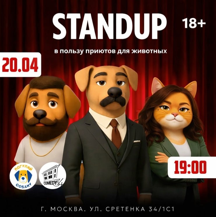 ! ΠΠ°ΡΠΈ Π΄ΡΡΠ·ΡΡ ΡΡΠ΅Π½Π΄Π°ΠΏ-ΠΊΠ»ΡΠ± Comedy 34 ΠΊΠ°ΠΆΠ΄ΡΠΉ ΠΌΠ΅ΡΡΡ ΠΏΡΠΎΠ²ΠΎΠ΄ΡΡ Π±Π»Π°Π³ΠΎΡΠ²ΠΎΡΠΈΡΠ΅Π»ΡΠ½ΡΠ΅ ΡΡΠ΅Π½Π΄Π°ΠΏΡ Ρ ΡΡΠ°ΡΡΠΈΠ΅ΠΌ ΠΊΠΎΠΌΠΈΠΊΠΎΠ² Ρ Π’ΠΠ’ ΠΈ Youtube. Π ΡΡΠΎΡ ΡΠ°Π· Π²ΡΠ΅ Π΄Π΅Π½ΡΠ³ΠΈ Ρ Π±ΠΈΠ»Π΅ΡΠΎΠ² ΠΎΡΠΏΡΠ°Π²ΠΈΠΌ Π² ΡΠΎΠ½Π΄ "ΠΠΎΠΌΠ°ΡΠ½ΠΈΠΉ" ΠΊΠΎΡΠΎΡΡΠΉ ΡΠΎΠ΄Π΅ΡΠΆΠΈΡ Π΄Π²Π° ΠΏΡΠΈΡΡΠ° Π² ΠΠΎΡΠΊΠΎΠ²ΡΠΊΠΎΠΉ ΠΎΠ±Π»Π°ΡΡΠΈ, Π³Π΄Π΅ ΡΠ²ΠΎΠΉ Π΄ΠΎΠΌ ΠΆΠ΄ΡΡ Π±ΠΎΠ»Π΅Π΅ 1300 ΡΠΎΠ±Π°ΠΊ ΠΈ ΠΊΠΎΡΠΈΠΊΠΎΠ² Π Π΅ΡΠ΅ ΠΈΠΌΠ΅Π½Π½ΠΎ Ρ ΡΡΠΎΠ³ΠΎ ΠΏΡΠΈΡΡΠ° Π½Π°ΡΠ°Π»Π°ΡΡ ΠΈΡΡΠΎΡΠΈΡ ΠΠΎΠ³ΡΠ»ΡΠΉ ΡΠΎΠ±Π°ΠΊΡ 7.5 Π»Π΅Ρ Π½Π°Π·Π°Π΄) π 20 Π°ΠΏΡΠ΅Π»Ρ, 19.00 πΊ Comedy 34, ΠΠΎΡΠΊΠ²Π°, Π‘ΡΠ΅ΡΠ΅Π½ΠΊΠ°, 34/1Ρ1 (2 ΠΌΠΈΠ½ ΠΎΡ ΠΌ. Π‘ΡΡ