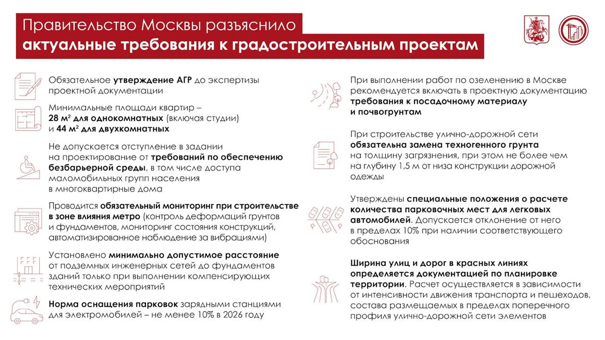 Москомэкспертиза и Мосгосстройнадзор направили застройщикам документ, систематизирующий требования к проектам строительства. В частности: ▪️ Минимальные площади квартир должны быть 28 кв. м для студий и однокомнатных, 44 кв. м для двухкомнатных. ▪️ Новые дома должны проектироваться с учетом доступности для маломобильных граждан: ширина дверных проемов — не менее 0,9 метра, выделение от 10% парковочных мест для граждан с инвалидностью. ▪️ Не менее 10% парковочных мест в 2026 году должны быть оснащены зарядными станциями для электромобилей. ▪️ Проводится обязательный мониторинг безопасности строительства в зоне влияния метро. ▪️ При строительстве улично-дорожной сети обязательна замена техногенного грунта. Недвижимость | Что Где Почём Мы в MAX