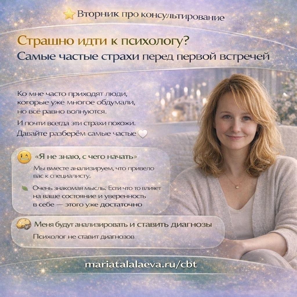 Страшно идти к психологу? Самые частые страхи перед первой встречей Если честно, бояться перед первой встречей с психологом — абсолютно нормально. Ко мне часто приходят люди, которые уже многое обдумали, но всё равно волнуются. И почти всегда эти страхи похожи. Давайте разберём самые частые 🤍 😬 «Я не знаю, с чего начать» Это один из самых распространённых страхов. Кажется, что нужно прийти с чёткой формулировкой запроса, логичным рассказом и «правильными словами». На самом деле — нет. Начать можно с любого места. Моя задача — помочь вам разложить всё по полочкам и задать нужные вопросы. 😔 «А вдруг моя проблема глупая или недостаточно серьёзная» Очень знакомая мысль. Но в консультировании не существует «недостаточно важных» переживаний. Если что-то влияет на ваше состояние, сон, отношения, уверенность в себе — этого уже достаточно, чтобы с этим работать. 🧠 «Меня будут анализировать и ставить диагнозы» В психологическом консультировании со мной нет ярлыков и поспешных выводов. Я испо