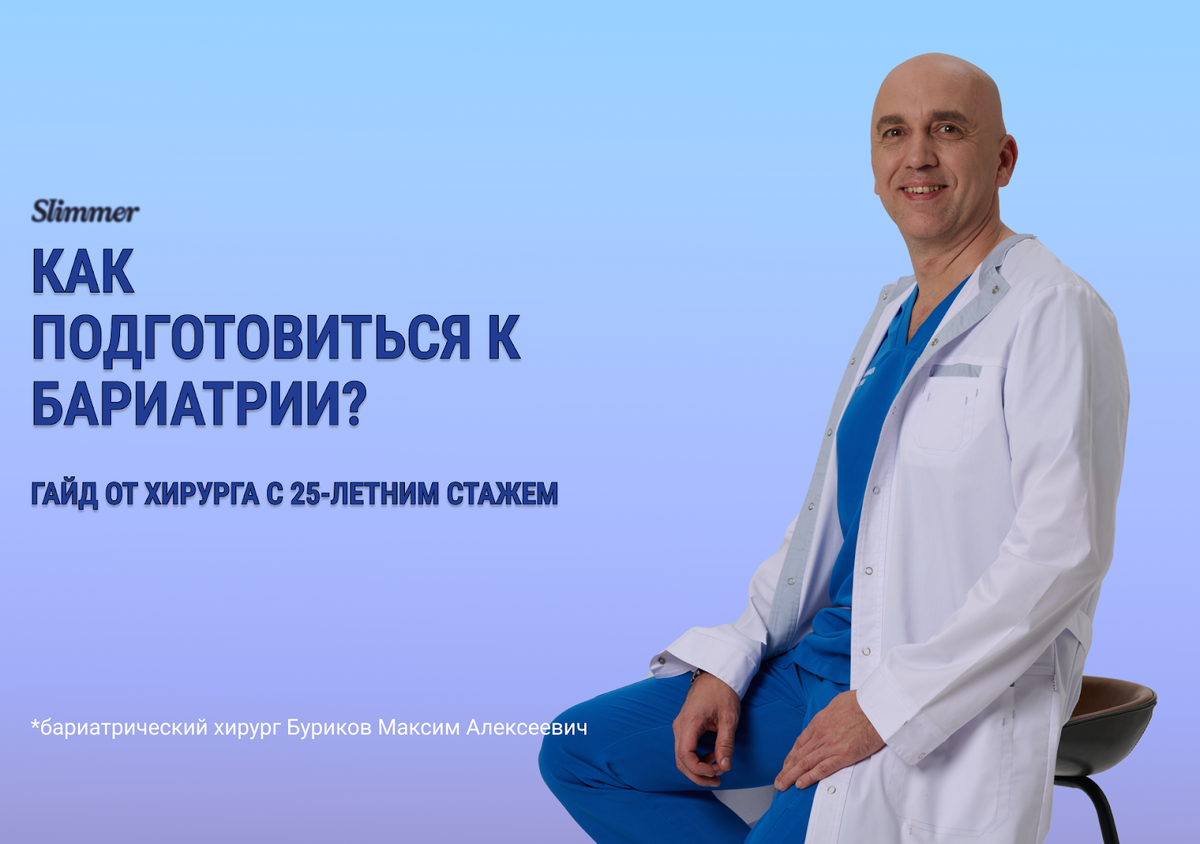 Если вы или ваш близкий столкнулись с диагнозом «ожирение», то, наверняка, вы уже слышали про бариатрическую хирургию. Бариатрическая хирургия — это операция, которая помогает людям с большим лишним весом похудеть. Врачи делают желудок меньше, чтобы человек съедал за раз совсем немного еды и быстро чувствовал сытость. Иногда еда после операции проходит по-другому пути, и организм забирает из неё меньше калорий. В результате человек теряет лишние килограммы и становится здоровее. Для кого-то знания этого способа борьбы с лишним весом так и остаются просто знаниями, а кто-то - решается на первый шаг на пути к более здоровой жизни. Многие пациенты впервые сталкиваются с необходимостью планового хирургического лечения, поэтому задаются множеством вопросов. Этот гайд отвечает на главные из них. Он составлен на основе материалов хирурга с 26-летним стажем, заслуженного врача РФ, доктора медицинских наук Максима Бурикова. 1. Пройдите консультацию бариатрического хирурга.