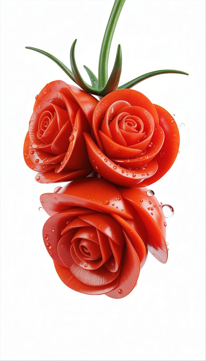 «3D‑изображение, крупный план: розы, сформированные из алых помидоров методом карвинга, висят на тонкой зелёной веточке. Гипердетализация: видны микротекстуры кожицы помидора, блики и тени на изгибах лепестков, капли росы. Белый фон подчёркивает композицию и цвета. Мягкое студийное освещение, глубина резкости, акцент на игре света и тени. Высокое разрешение, фотореалистичный стиль, чёткие контуры. Профессиональная 3D‑визуализация, акцент на художественном мастерстве карвинга» Вариант 2 (лаконичный, фокус на стиле и качестве):