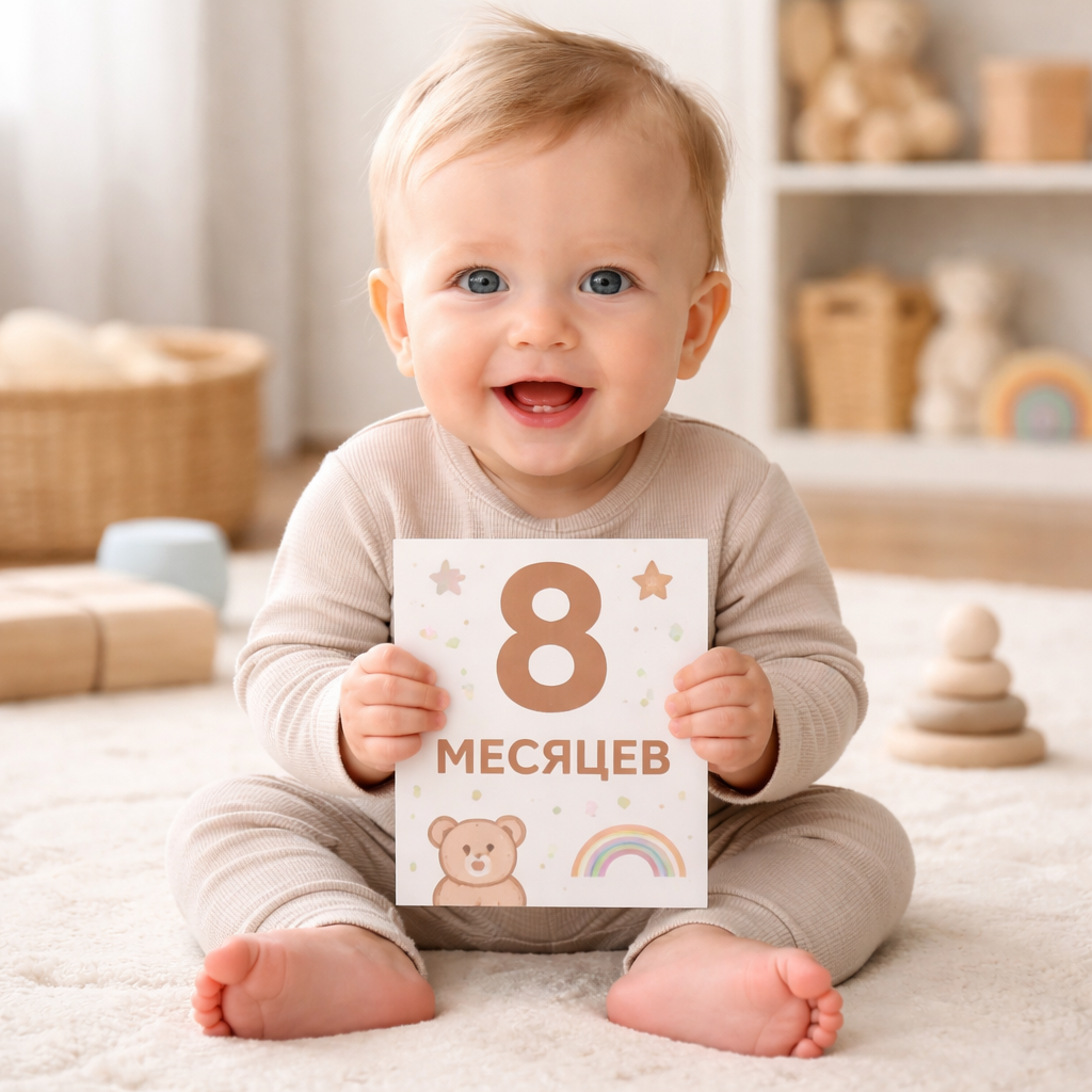 В 8 месяцев в малышом становится все интереснее играть и общаться. Он уже многое понимает в вашей речи и старается повторить простые слоги за вами. Ребенок дает вам больше свободного времени. Может долго играть сам, с интересом следит за вашими действиями, как вы стираете, готовите, встречаете гостей. И неизменно следует за вами по всей квартире! Это важный и ответственный этап развития каждого малыша! Научиться сидеть, ползать и вставать у опоры - это большой подвиг маленького человека! И самое главное - любящая отдохнувшая спокойная мама, тогда и папа, и ребенок будут счастливы!