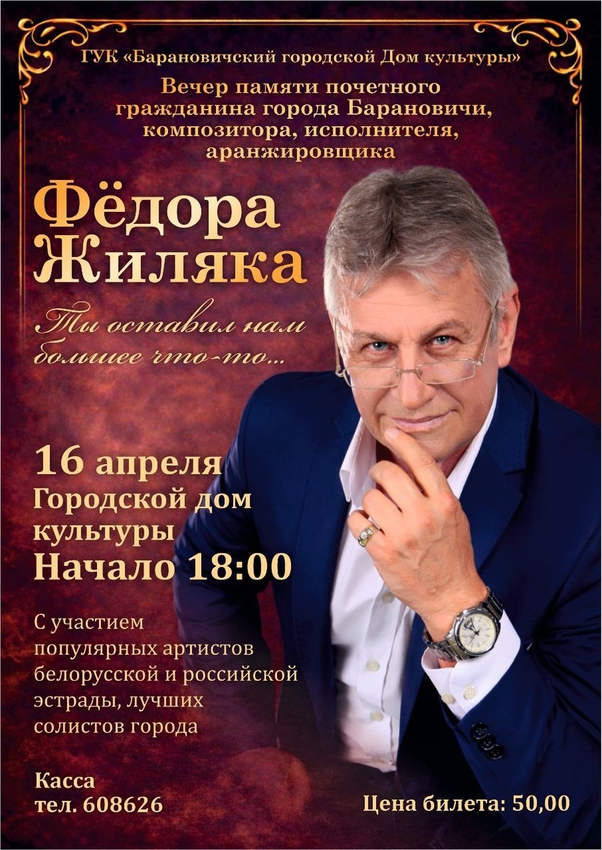 , аранжировщика Фёдора Жиляка, который состоится в ГУК «Барановичский городской Дом культуры». В концерте также примут участие Анатолий Ярмоленко, Ядвига Поплавская и другие. Средства, вырученные от мероприятия, будут направлены на изготовление памятника и мемориальной доски. Билеты можно приобрести через кассы Дома культуры: 8(0163) 60-86-26. Также вы можете обратиться в сообщения канала, и мы постараемся помочь вам с приобретением. 📌 ГУК «Барановичский городской Дом культуры» (Респ. Беларусь, Брестская обл., г. Барановичи, ул. Ленина, д. 4А); 📌 16 апреля в 18:00.