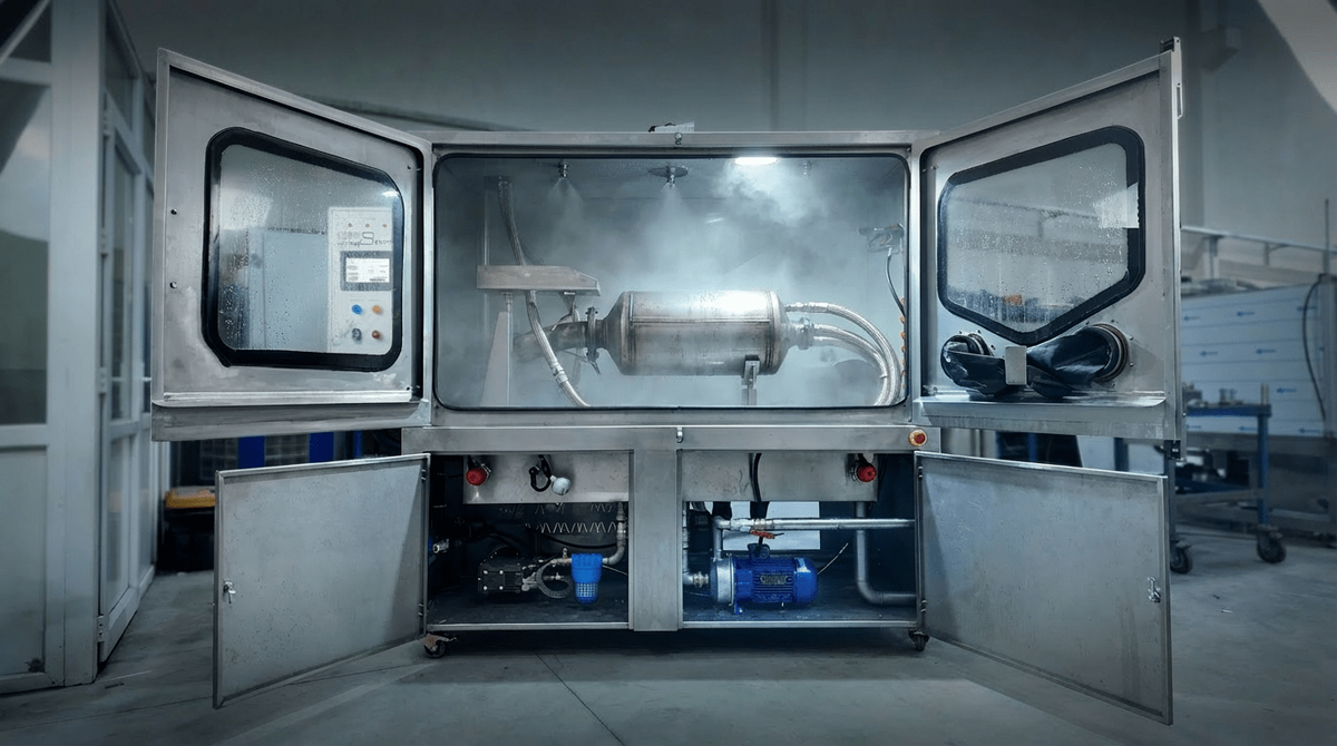 Гидродинамическая очистка. Сам фильтр снимается с автомобиля и устанавливается в специальное оборудование. Через него под давлением (3–6 бар) импульсно прогоняется вода в смеси с биоразлагаемыми реагентами. Такой режим позволяет эффективно удалять не только сажу, но и зольные отложения, масляные пленки — то, что невозможно выжечь при обычной регенерации. При этом давление подбирается индивидуально под конкретный фильтр, что исключает риск повреждения хрупкой керамики.