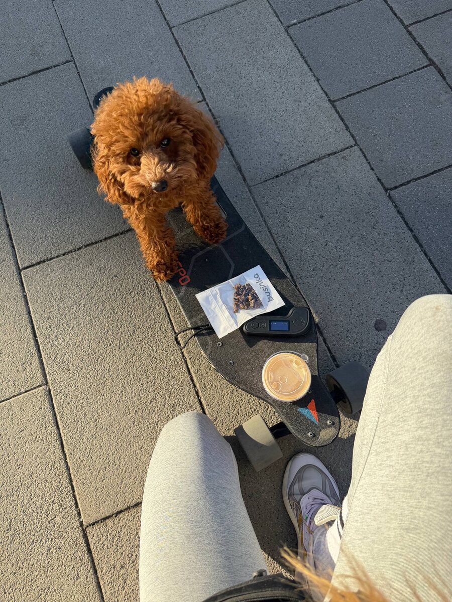 Вчера учила Марси кататься на электроскейте, но она пока трусит)) зато на мотик первая бежит