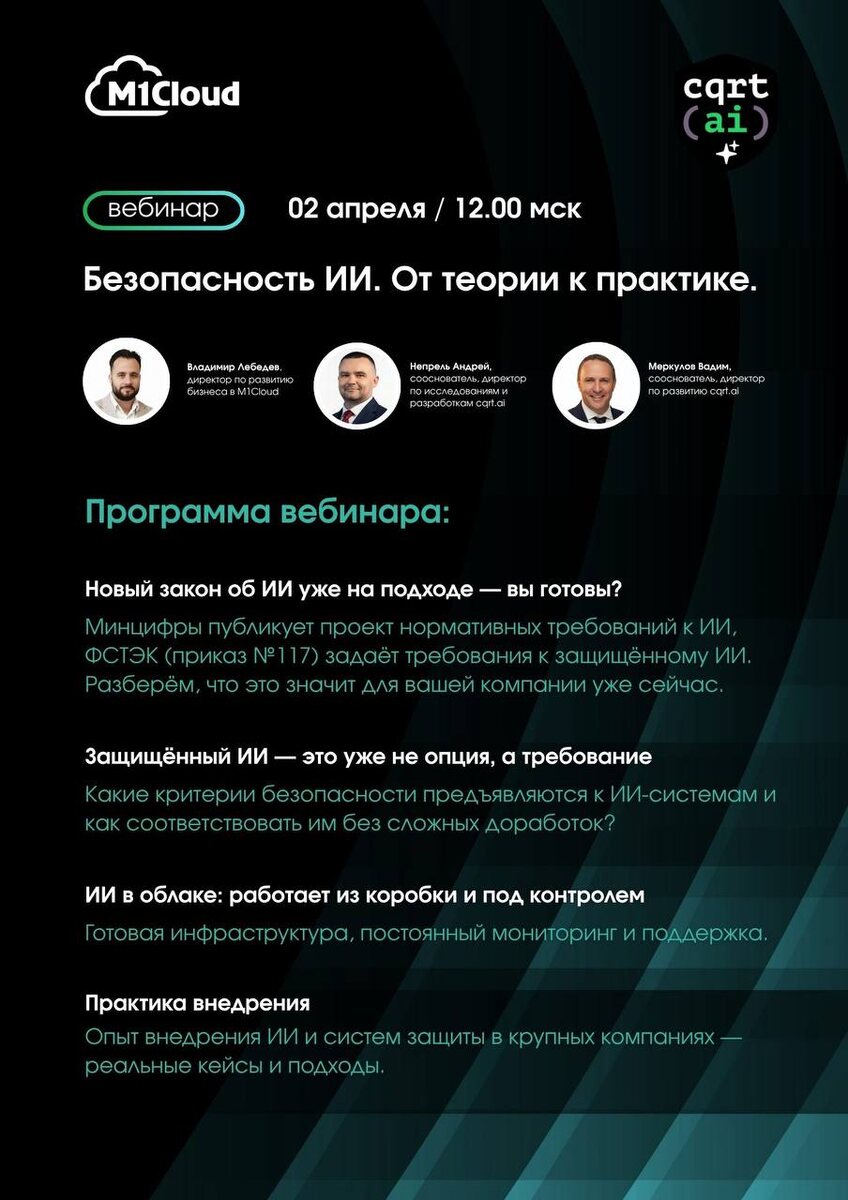 🔵🔵🔵🔵🔵 ИИ — это круто. А безопасный ИИ — обязательно. 2 апреля в 12:00 мск приглашаем на вебинар, где разберутся, как подружить искусственный интеллект с требованиями регуляторов и не сойти с ума. «Безопасность ИИ. От теории к практике» Спикеры: M1Cloud и cqrt.ai Поговорим о том, что уже скоро станет обязательным: 📌 новый закон об ИИ и требования ФСТЭК — что с ними делать? 📌 как сделать ИИ защищённым без сложных доработок? 📌 облако, которое работает «из коробки» и под контролем 📌 и, конечно, реальные кейсы внедрения в крупных компаниях Без лишней теории. С фокусом на практику. 🖇 Участвовать (и да, там будет не только про регуляторику, но и про то, как это реально работает) #GDS #M1Cloud #cartai #безопасностьИИ #вебинар #искусственныйинтеллект