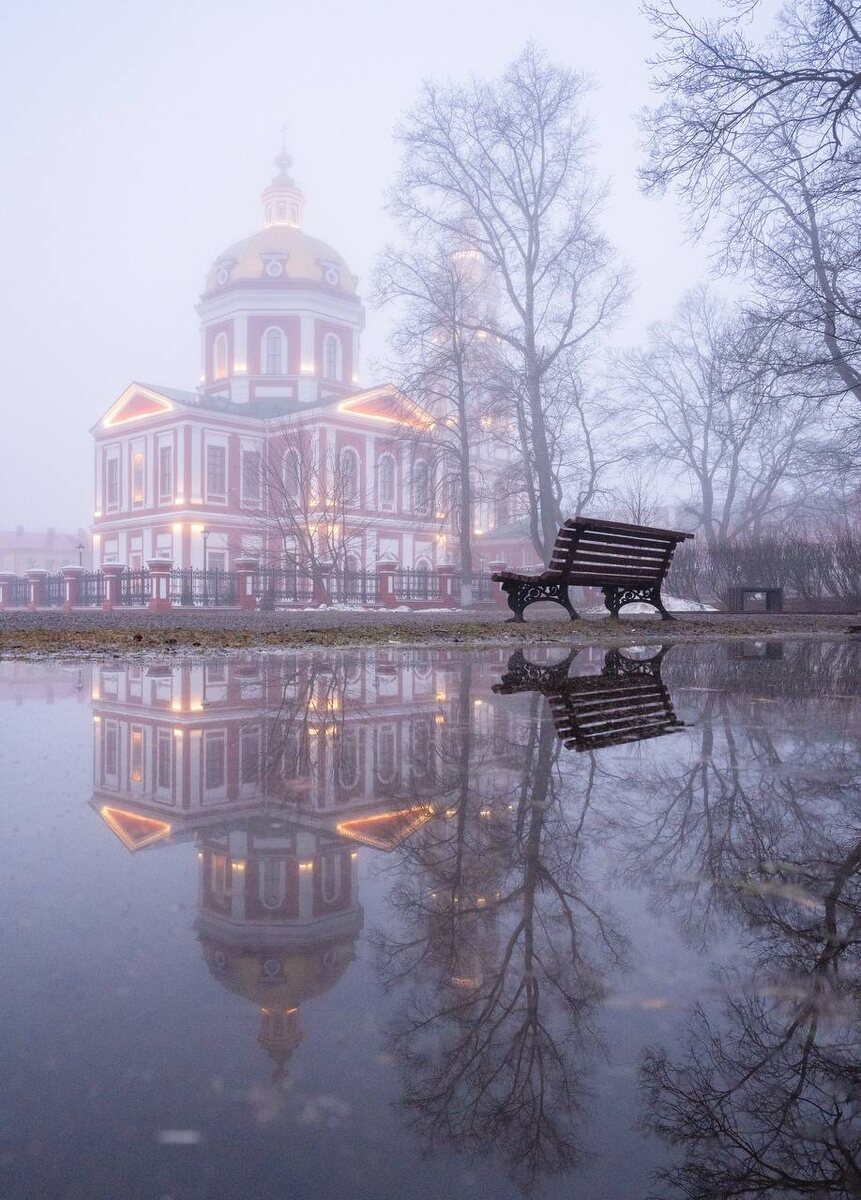 Что делает фотографию по-настоящему особенной? Для меня ответ прост: это редкая возможность остановить время. Поймать то самое короткое мгновение, которое больше никогда не повторится в точности так же. В это утро старый Киров преобразился. Густой весенний туман окутал улицы, спрятав лишний шум и суету, оставив меня наедине с тишиной и величественным Спасским собором. Красота, которая прячется под ногами Многие в марте стараются быстрее перебежать через лужи, ворча на слякоть и сырость. Но для человека с камерой лужа — это не помеха, а настоящий портал в другой мир. В то утро вода на мостовой стала идеальным зеркалом. Красные стены собора, подсвеченные мягким тёплым светом, и его золотые купола будто выплывали из молочной дымки дважды: один раз в небе, а другой — в неподвижной глади воды. В этом отражении не было ряби, только чистота и покой. Мгновение, застывшее в тумане В этом кадре сошлось всё: причудливые узоры ещё голых ветвей, замершая у края «зеркала» скамейка и свет, который м