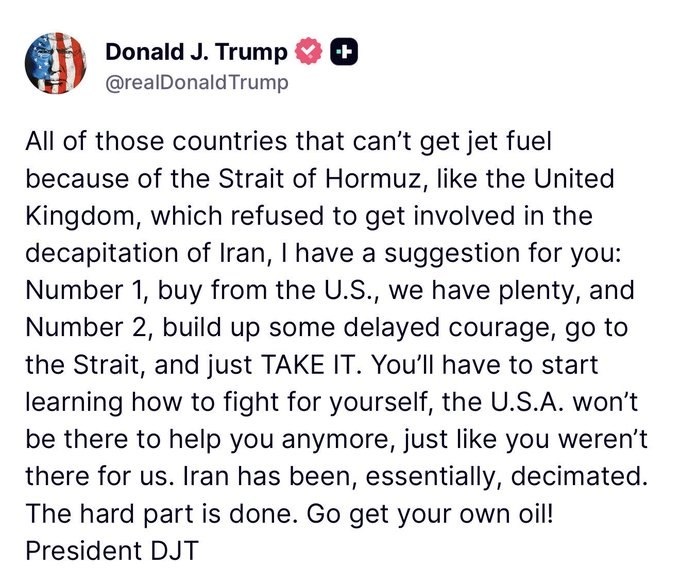 " Трамп предложил странам, которым не хватает топлива из-за блокировки Ормузского пролива, решить свои проблемы самостоятельно. Пролив открыт - просто "наберитесь смелости", написал он. Также он предложил второй вариант - купить топливо у США. Подписаться | Написать нам | Дзен | ШортЫ в МАХ