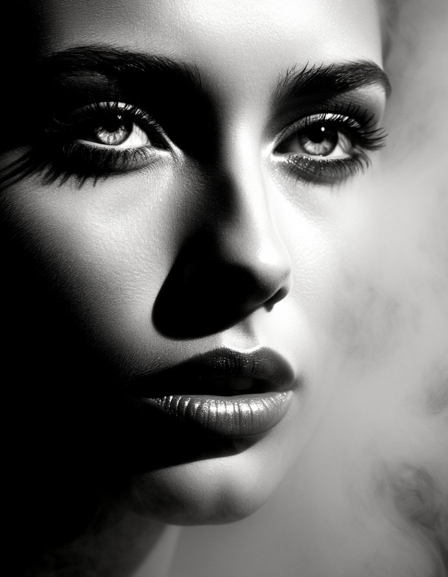 «Потрясающая художественная фотография: лицо частично скрыто в тени стены, фон — густой туман. Яркие глаза и блестящие губы выделяются на фоне темноты, создавая интригу. Высококонтрастная чёрно‑белая фотография, светотеневое освещение. Игра света и тени формирует драматическую атмосферу. Монохроматическая палитра, концептуальное искусство. Современная цифровая эпоха, высокое разрешение, глубина резкости. Крупный план, фокус на глазах и губах» Вариант 2 (лаконичный, фокус на стиле и контрастах):
