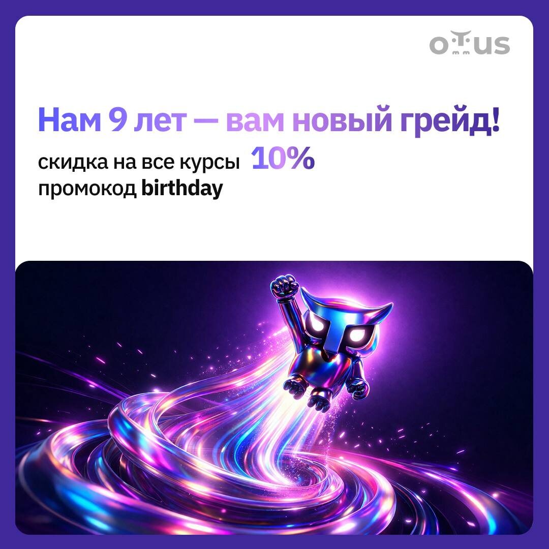 ! 9 лет на рынке, 9 лет опыта, 9 лет создания карьерных возможностей для специалистов в разных областях. В честь дня рождения OTUS мы даем вам возможность сделать апгрейд вашей карьеры! Мы поможем вам: 🔹Освоить новый грейд и стать экспертом, чьи навыки уже сейчас нужны работодателям. 🔹Разрабатывать версию кода, которая будет внедряться без долгих итераций. Выбирайте любой курс из нашей программы и получайте скидку 1️⃣🔟🔤 по промокоду birthday. Это ваш шанс учиться по самой выгодной цене! Что вы получите? 🔸Новый уровень знаний и навыков. 🔸Прокачку в той области, которая вас реально интересует. 🔸Уверенность в том, что ваш карьерный рост не ограничен! Не откладывайте на завтра. Сделайте шаг к новой карьере — забронируйте место на курсе прямо сейчас. *скидка суммируется с другими акциями на сайте!