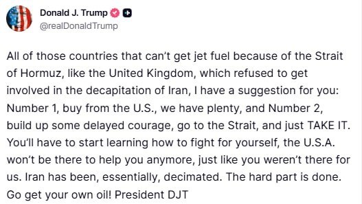 ! Трамп обратился к странам, которым трудно получить авиатопливо из-за Ормузского пролива (например, к Великобритании, что не захотела вмешиваться в ситуацию с Ираном). У него два предложения: 1. Покупайте у США – у нас его достаточно. 2. Наберитесь смелости, идите в пролив и просто забирайте свое! «Вам придется учиться бороться за себя. США больше не будут помогать, раз вы не помогали нам. Главное с Ираном уже позади. Идите и добывайте свою нефть!» – заявил он. Подписывайся