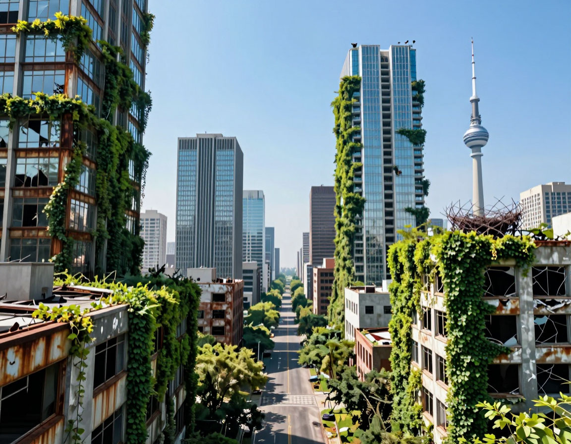 - Стеклянные небоскребы — почти все разрушены. Стекло не выдержало ни ударной волны, ни 50 лет без обслуживания. Остались только стальные каркасы, которые теперь служат вертикальными «лесами» для вьющихся растений.