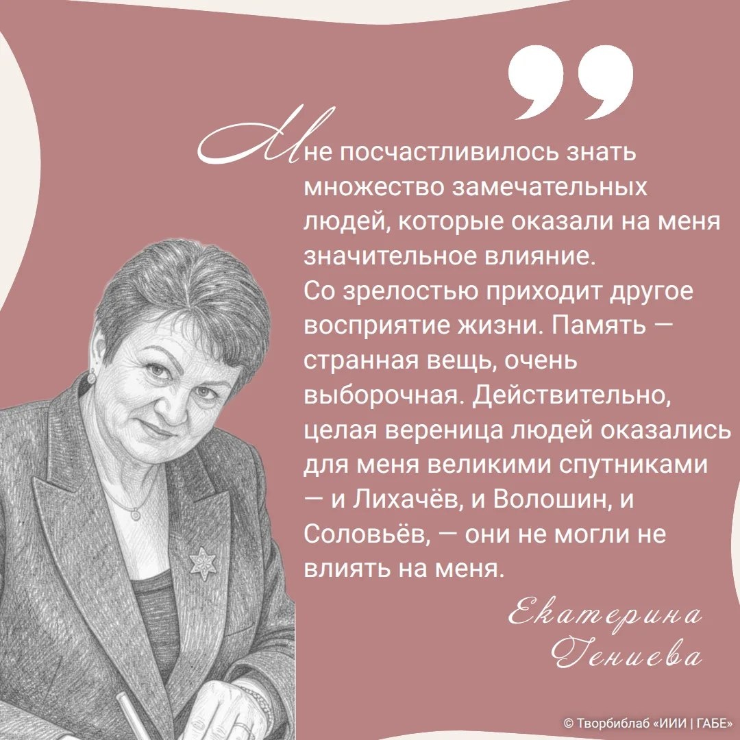 В течение нескольких дней мы будем вспоминать яркие цитаты Екатерины Юрьевны Гениевой, или, как многие из нас её называли, — «нашей Кати». 💬 Первая — прямо сейчас! Продолжение следует… 💜 Подписывайтесь на канал Культунарион ГАБЕ в МАХ