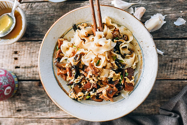 Суть блюда не в лапше как таковой, а в густой северной основе, которую кладут сверху: со свиной грудинкой, шиитаке, древесными грибами, лилейниками и яйцом. Это не суп и не соус в привычном западном смысле. Это отдельная, собранная форма еды. Лапша здесь нужна не как гарнир, а как носитель.