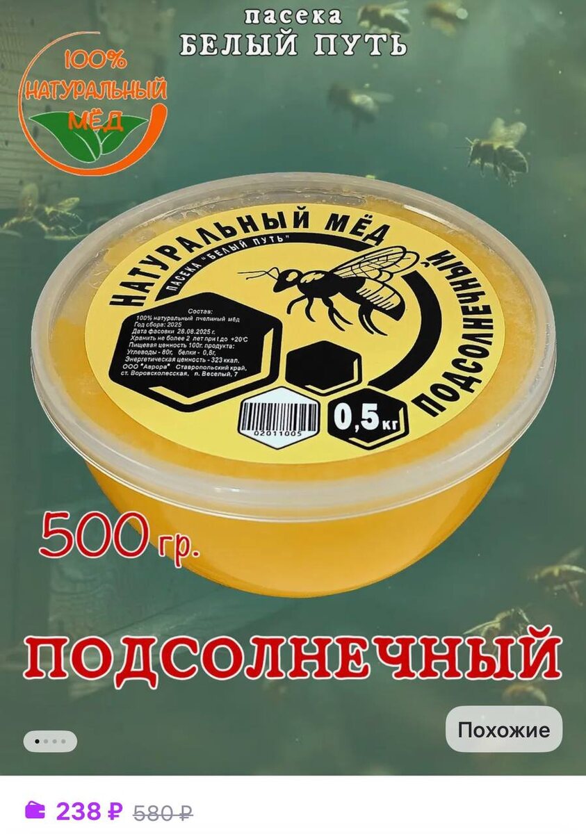 Пасека Белый путь Мед натуральный Подсолнечный, 500 гр