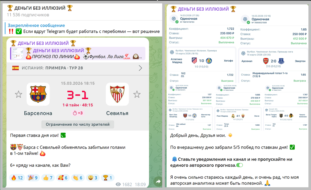 Я долго ставил с телеграм каналом Деньги без иллюзий и готов поделится своим честным отзывом о нем. Сначала были мысли, что это очередной мошенник, который хочет нажиться на моих деньгах, но решил проверить своими деньгами, потому что несколько человек его советовали как профи. Мне понравился легкий подход автора, который чередует серьезную аналитику с мемчиками, смешными гифками по теме и не скрывает собственную личность. Как тут обстоят дела с выигрышами, и нет ли мошенничества — смотрим дальше. Итак, очевидные факты. Телеграм-канал называется Деньги без иллюзий. Почти 10 тысяч подписоты. В описании сказано, что это один из лучших в СНГ каналов по проходимости сигналов, где не занимаются гаданиями по ставкам, а реально анализируют. Админ – Николай Городецкий, на фото простой парень без наворотов. Хотя в постах типа лайфстайл конечно навороты уже дальше пошли, но то такое… Посты — продуманный микс прогнозов, ставок, аудио- и видео-сообщений. Админ рекомендует использовать контору Мел