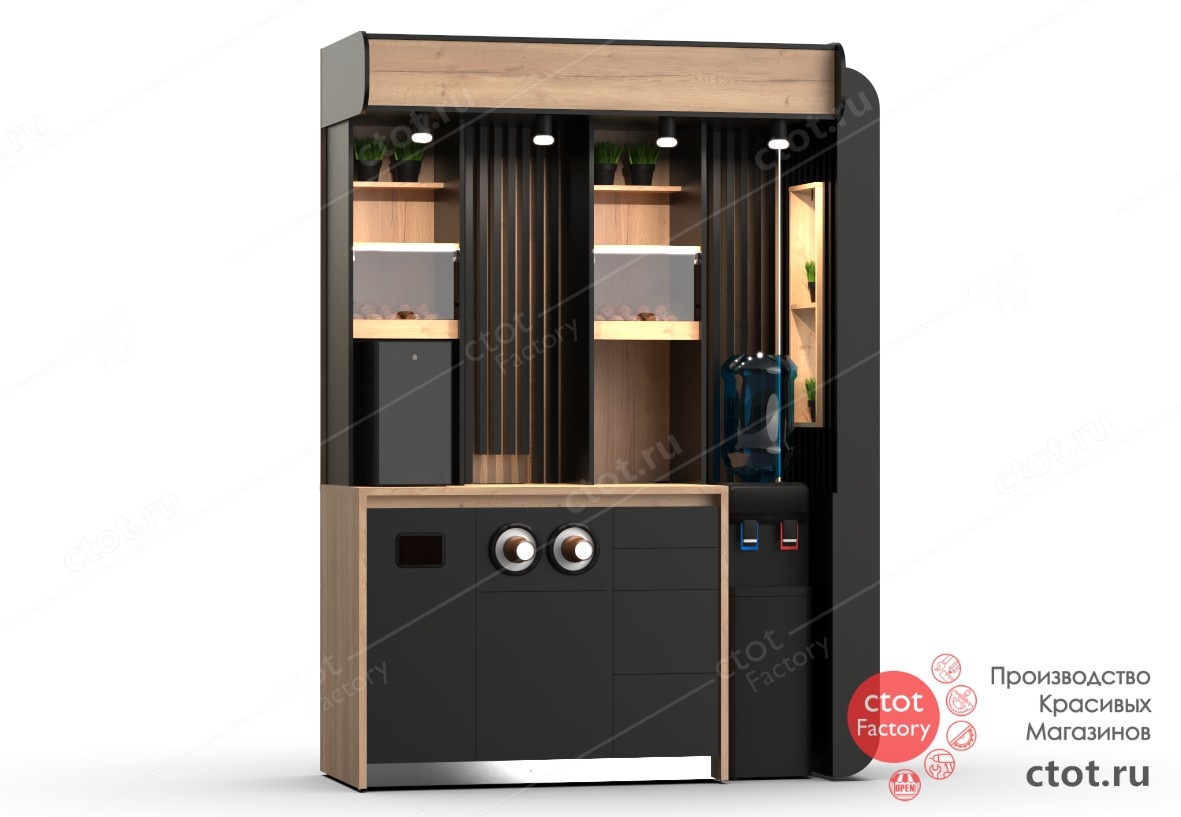 Кофе-модуль выполнен в фирменной эстетике Ctot Factory: сочетание глубоких тёмных оттенков с натуральной текстурой дерева создает ощущение уюта и премиальности. Вертикальные рельефные элементы добавляют архитектурности, а встроенная подсветка мягко акцентирует зоны выкладки. Отдельного внимания заслуживают ниши с цветочным декором - зелёные акценты «оживляют» пространство, делая кофе-корнер визуально лёгким и дружелюбным. Такой подход соответствует современным принципам биофильного дизайна, который доказано снижает стресс и повышает продуктивность. Функциональная сторона кофе-модуля включает в себя: зоны под выпечку с удобной выкладкой для быстрого доступа, полки под банки варенья, сахара и топпингов, интегрированное место под кулер с водой, два диспенсера для стаканов разных размеров, встроенный лючок дл