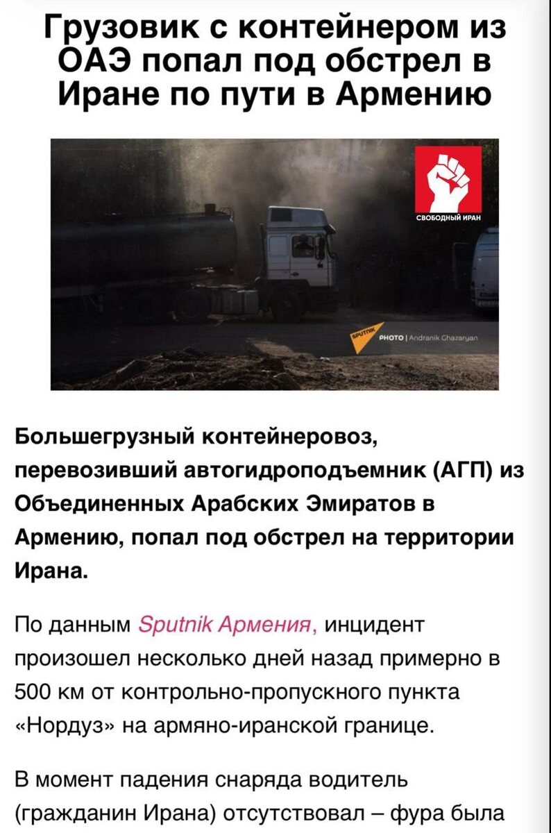 🚛💥 По данным Sputnik Армения, контейнеровоз с автогидроподъёмником, следовавший из ОАЭ в Армению, обстреляли на территории Ирана примерно в 500 км от КПП Нордуз. Водителя в момент удара в кабине не было, поэтому обошлось без жертв. Повреждённый контейнер уже доставили в Ереван, ущерб сейчас подсчитывают. Подпишитесь на канал