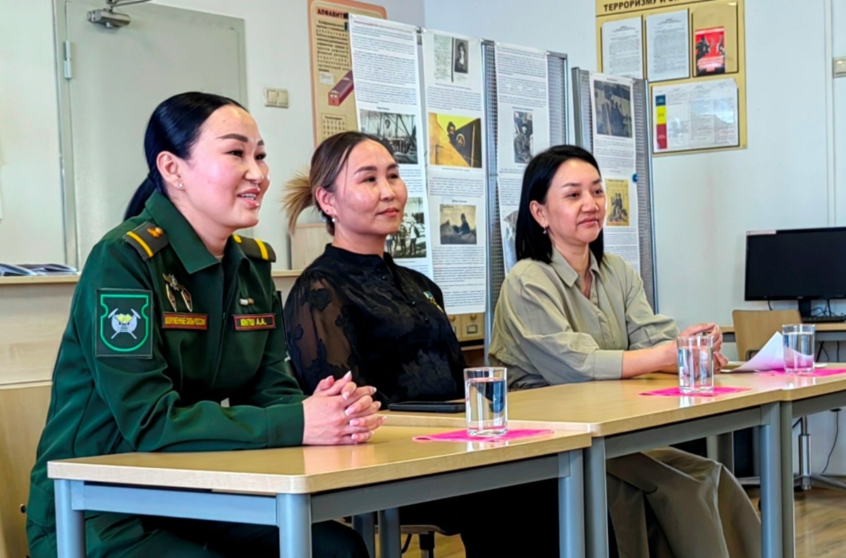 В Кадетском Президентском Кызылском училище 18 марта во второй учебной роте прошёл интересный и трогательный классный час на тему «Женщины — герои». Встреча состоялась в необычной атмосфере живой беседы с участием приглашённых гостей: Айдысмы Аясовны Монгуш – ветерана боевых действий, участницы специальной военной операции и родителей кадет 2 учебной роты – Шорааны Ошку-Сааровны Сайфуллиной и Чаяны Геннадьевны Монгуш. Подвиг Айдысмы Монгуш, медика из Тувы, в 30 лет ставшей известной своей отвагой в зоне СВО, покорил всю Россию. За свою отвагу Айдысмаа Аясовна награждена медалями «За спасение погибавших» и «За воинскую доблесть». Она прошла сложный путь, при этом остается заботливой и нежной мамой троих детей. Кадеты услышали искренние истории о том, каким бывает настоящий женский героизм — незаметный, тихий, постоянный. Гости искренне поделились собственными жизненными историями, рассказывая о буднях матери, когда ей приходится нести на своих хрупких плечах огромный груз ответственност