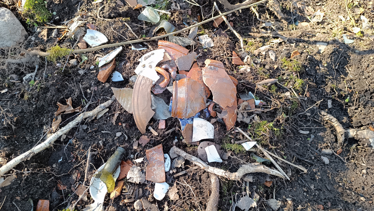 Закладывая шурф у самого основания кирпичной кладки, я поразился тому, что увидел. Лопата с хрустом входила в сплошной слой битого стекла и керамики.