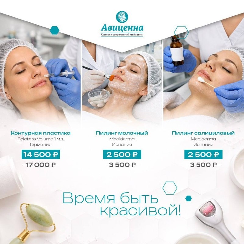 ! Мы подготовили для вас специальные предложения на популярные процедуры: 💉 Контурная пластика Belotero Volume (1 мл, Германия) - всего 14 500 ₽ вместо 17 000 ₽. Идеально для восполнения объёма, коррекции контуров лица и естественного омоложения. 🧴 Молочный пилинг Mediderma (Испания) - 2 500 ₽ вместо 3 500 ₽. Деликатное обновление кожи, сияние и ровный тон без агрессивного воздействия. 🧴 Салициловый пилинг Mediderma (Испания) - 2 500 ₽ вместо 3 500 ₽. Отличный выбор для проблемной кожи: уменьшает воспаления и очищает поры. 💬 Количество мест по акции ограничено — успейте записаться. 📍 Красота начинается с заботы о себе — доверьтесь профессионалам «Авиценны»