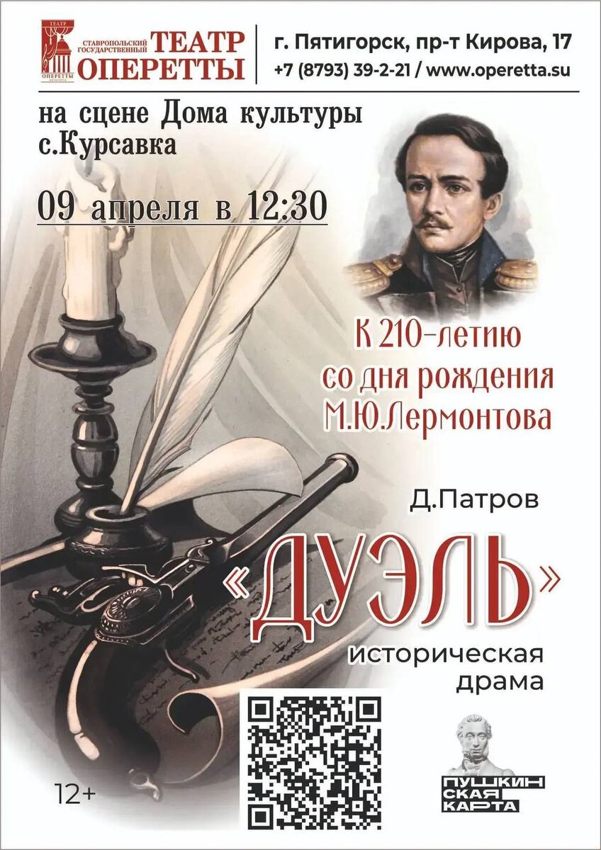 Ю. Лермонтова известно далеко за пределами России. Его произведения переведены на многие языки мира. По долгу службы и жизненных обстоятельств поэт неоднократно бывал на Кавказе и, в частности, в Пятигорске. Здесь он отбывал ссылку, лечился от ревматизма. Здесь же и состоялась трагическая дуэль, оборвавшая его жизнь. В спектакле «Дуэль» положены 2 периода жизни поэта: 1837 и 1841 г.г. Спектакль станет исторической зарисовкой событий, произошедших в тот Пятигорский период: встреча с сокурсником Сатиным, знакомство с литературным критиком Белинским, бал в гроте Дианы, и злополучный вечер в доме Верзилиных. Спектакль «Дуэль» - это очередная попытка разобраться в обстоятельствах и причинах трагической дуэли.