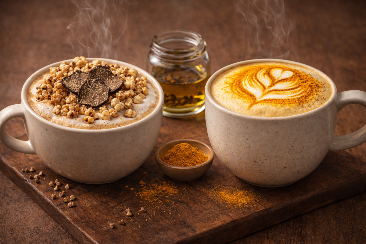 В московских кофейнях «Лалибела кофе» появились два авторских напитка, которые звучат как блюда из ресторана: латте с трюфелем и гречневым попкорном, а также латте карри. Разбираемся, что это за тренд и можно ли повторить нечто подобное дома. Долгое время кофейная культура держалась на классике: эспрессо, капучино, латте. Но сегодня бариста всё чаще экспериментируют, заимствуя идеи из высокой кухни. Апельсин, соль, пряности - а теперь трюфель и карри. «Мы не хотели делать напитки ради шока или хайпа. Нам было важно найти вкус, к которому захочется возвращаться. Поэтому мы долго искали баланс - чтобы сочетания оставались смелыми, но при этом гармоничными», - говорит бренд-менеджер сети. Главная новинка - латте с трюфелем и гречневым попкорном. Авторы описывают его как глубокий, с землистой нотой, деликатной солоноватостью и хрустящим финалом. Вкус умами от трюфеля отлично сочетается с молочной основой латте. Гречневый попкорн (воздушная гречка) добавляет текстуру и интересное послевкуси
