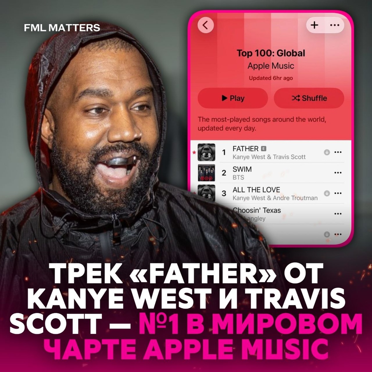 👊 KANYE WEST И TRAVIS SCOTT УНИЧТОЖИЛИ BTS! Трек «FATHER» от Йе и Трэвиса и поднялся на #1 в глобальном чарте Apple Music и обошёл BTS. Более того, сразу несколько треков с «BULLY» ворвались в верхние строчки чарта. Монстры? ❤️🔥/👎 💀 FML MATTERS