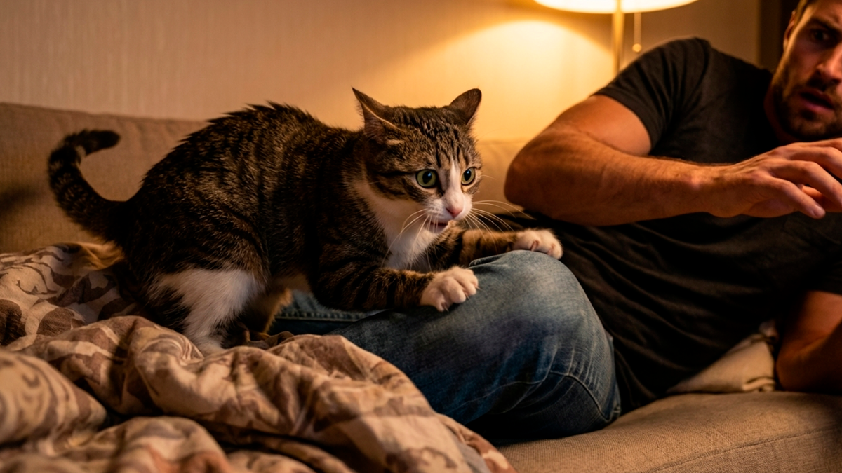 Вторая - перевозбуждение и нехватка правильного выхода энергии. Если кошка весь день одна, ей не с чем играть и не на что охотиться, энергия копится. Когда вы приходите и садитесь на диван, она видит наконец движение и переключается на первый попавшийся объект. Внешне это выглядит как внезапная агрессия, хотя на самом деле просто не было других способов разрядиться.