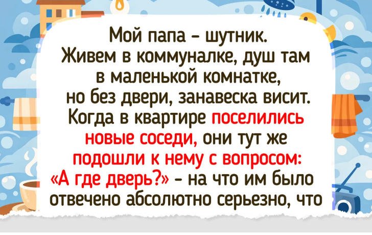 - Мой папа — шутник. Живем в коммуналке, душ сделан в виде маленькой комнатки, но без двери, занавеска висит. Когда в квартире поселились новые соседи, они тут же подошли к нему с вопросом: «А где дверь?» — на что им было отвечено абсолютно серьезно, что у каждого из соседей дверь своя, и когда они идут мыться, они просто вешают ее на петли, а потом также забирают с собой. Видели бы вы глаза соседей, когда эти студентки просили их показать свою дверь для душа, чтобы заказать себе такую же.