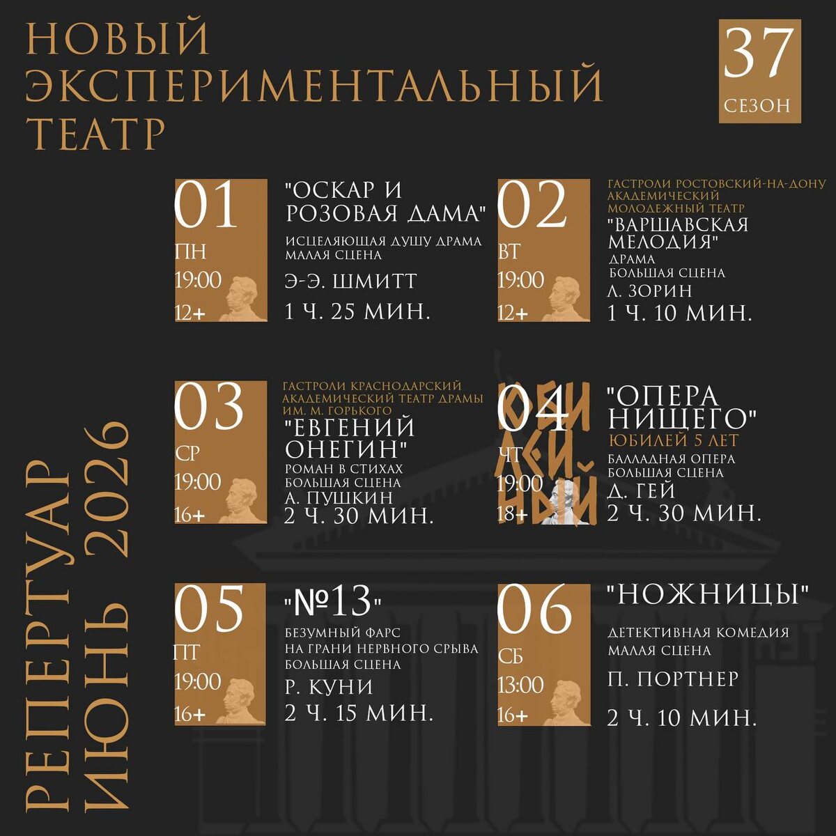 Вашему вниманию предлагается афиша, в которой – премьера, гастроли и много постановок на любой вкус и настроение. 12 и 13 июня НЭТ представит заключительную премьеру 37-го сезона. Это будет спектакль «333» на Малой сцене. В основе пьесы Сергея Лагунова история добровольца Павла, который спасает бездомных животных в зоне боевых действий, а от смерти его оберегает молитва. Режиссер-постановщик – Дмитрий Макаров. В рамках Всероссийского проекта «Театральный поезд» на Большой сцене НЭТа пройдут два спектакля. 2 июня Молодежный театр Ростова-на-Дону покажет «Варшавскую мелодию». 3 июня Краснодарский академический театр драмы им. М. Горького познакомит волгоградских зрителей с романом в стихах Александра Пушкина «Евгений Онегин». Подробней об этом – чуть позже! В июне будут два показа спектакля «Волки и овцы» (премьера которого намечена на 29 мая), а еще «Чудо в Большом городе», «Опера нищего», «Портрет Дориана Грея», «Дотянуться до мечты», «Мир Андерсена», «Ужин по-французски», «Отель д